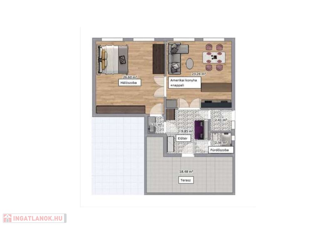 - nappali + étkező + konyha egy légtérben